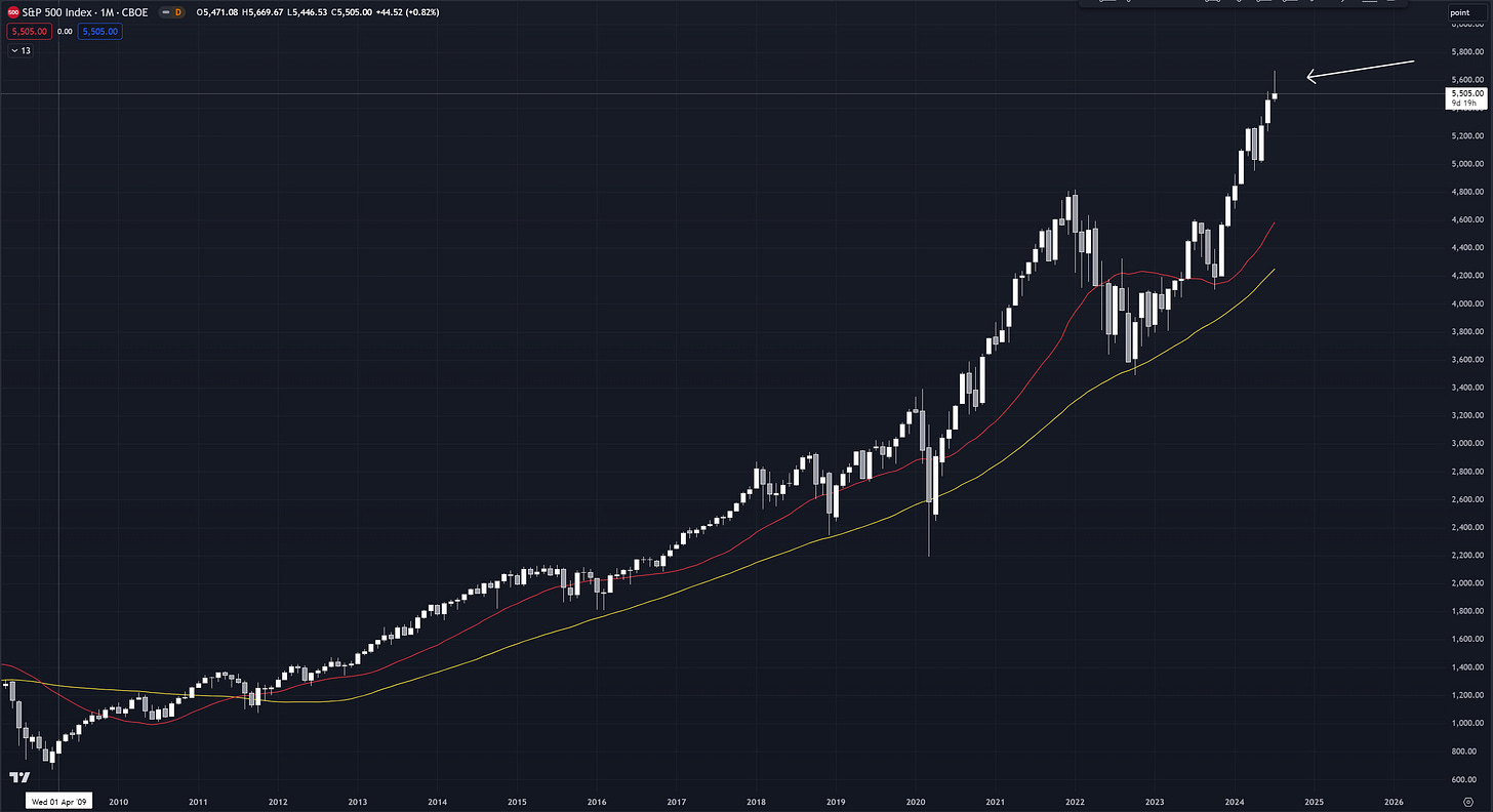 If we were to close the month of July as the chart looks right now I would be very concerned to say the least.. Turmoil and uncertainty are not good for markets. Paired with an exhaustive candle like we have so far and quantitatively being this far from our 50 month moving average is a perfect recipe for a pull back.