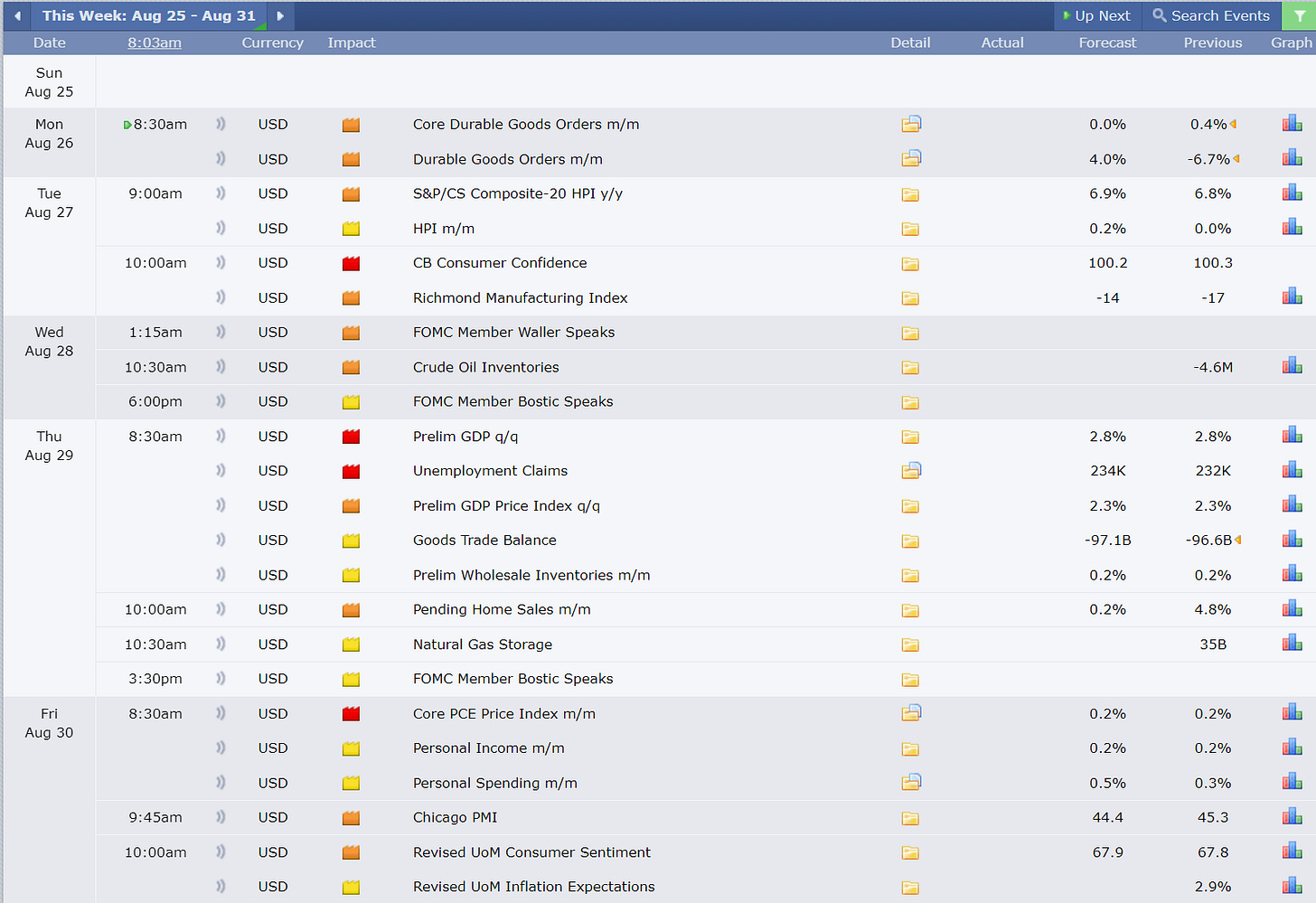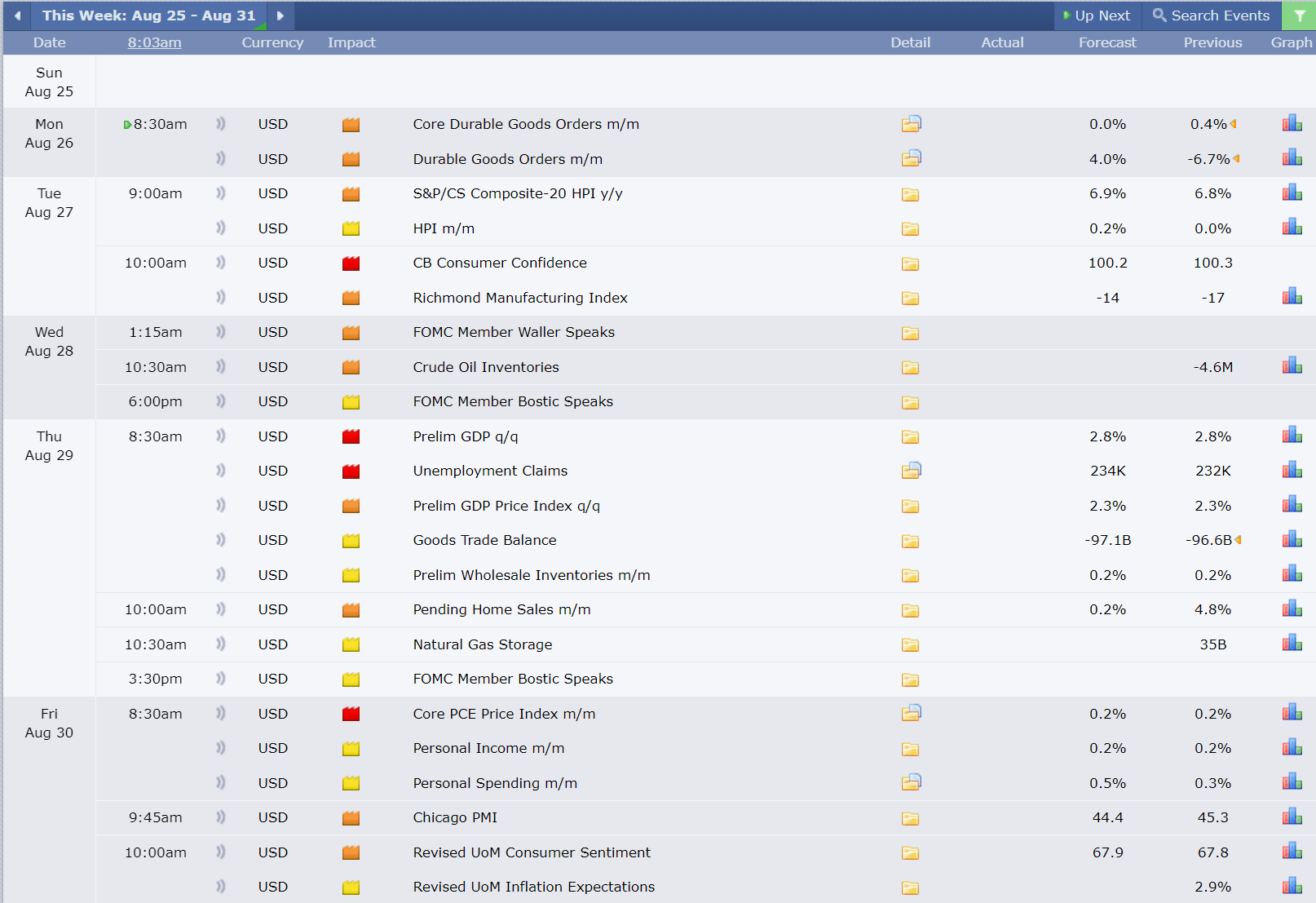 Looking ahead, this week is relatively light on economic data. The key points to watch are Thursday’s Q2 GDP figures and Jobless Claims, along with Friday’s PCE numbers. While the market remains more concerned with growth and the labor market than inflation at the moment, a report that is too soft could be interpreted negatively.