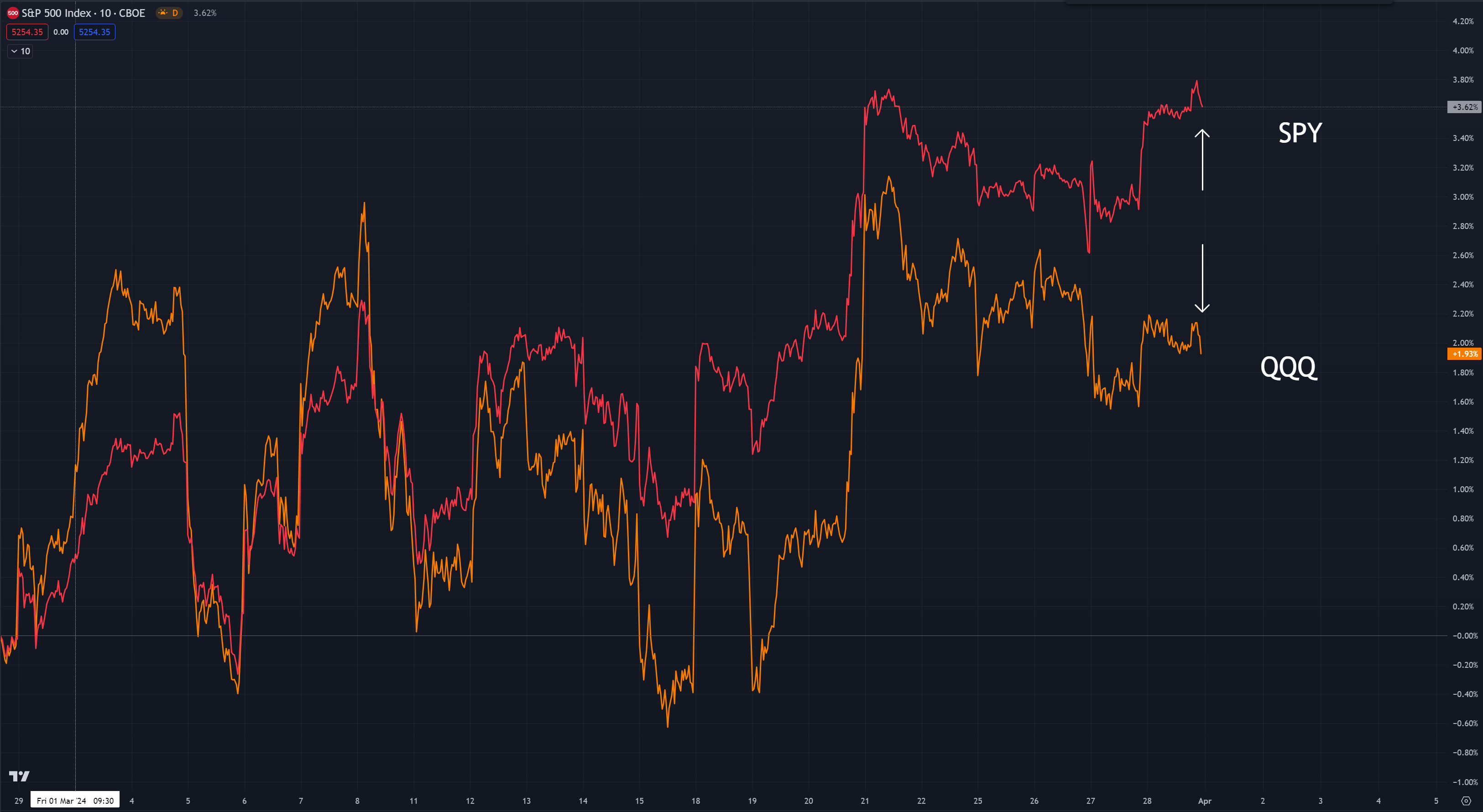 $SPY finished Q1 2024 up 10% as investors piled into a smaller group of Tech stocks, namely Semi-conductors. As the quarter came to a close a notable trend emerged that sparked our interest. In the month of March $QQQ underperformed $SPY by almost 2x, 1.93% vs. 3.62% respectively..
