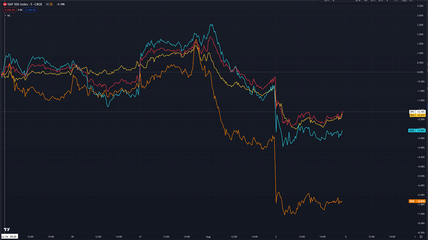 This past week was quite eventful in the markets. Early in the week, we witnessed a significant drop in tech stocks, hitting what seemed like a low point. This dip contributed to the Nasdaq's most substantial gain of the year, jumping nearly 4%. However, as the week went on, the mood shifted. A lower-than-expected ISM Employment Index sparked fears of slowing growth, reversing much of Wednesday's gains. The situation worsened on Friday with a disappointing jobs report and a rise in the unemployment rate from 4.1% to 4.3%, prompting concerns that a recession could be around the corner.