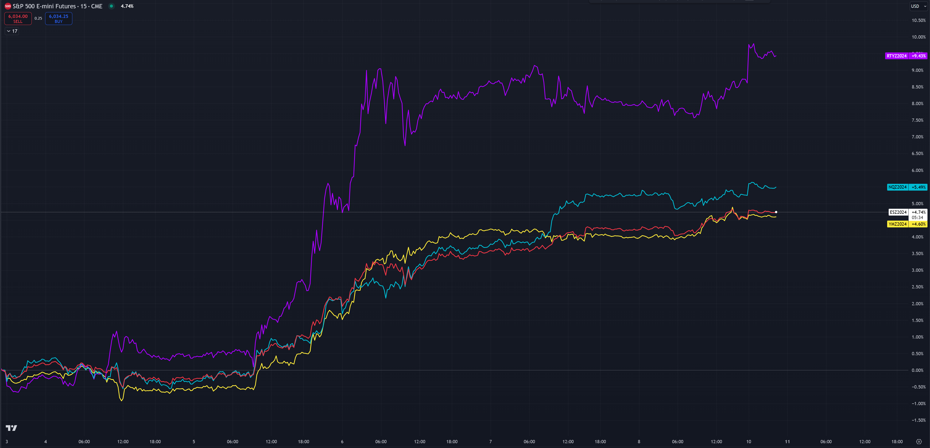 This past week was eventful for the stock market, marked by fresh highs across major indices as investors navigated both Election Day and the FOMC meeting with resilience. Small-cap stocks stood out, nearing their all-time highs from 2021, though not quite breaking through. On Friday, the S&P 500 even crossed the 6,000 mark, continuing this year’s historic trajectory. Small-caps led the charge, surging by an impressive 9%—a rally reminiscent of the “Trump trade” boost seen after the 2016 election.